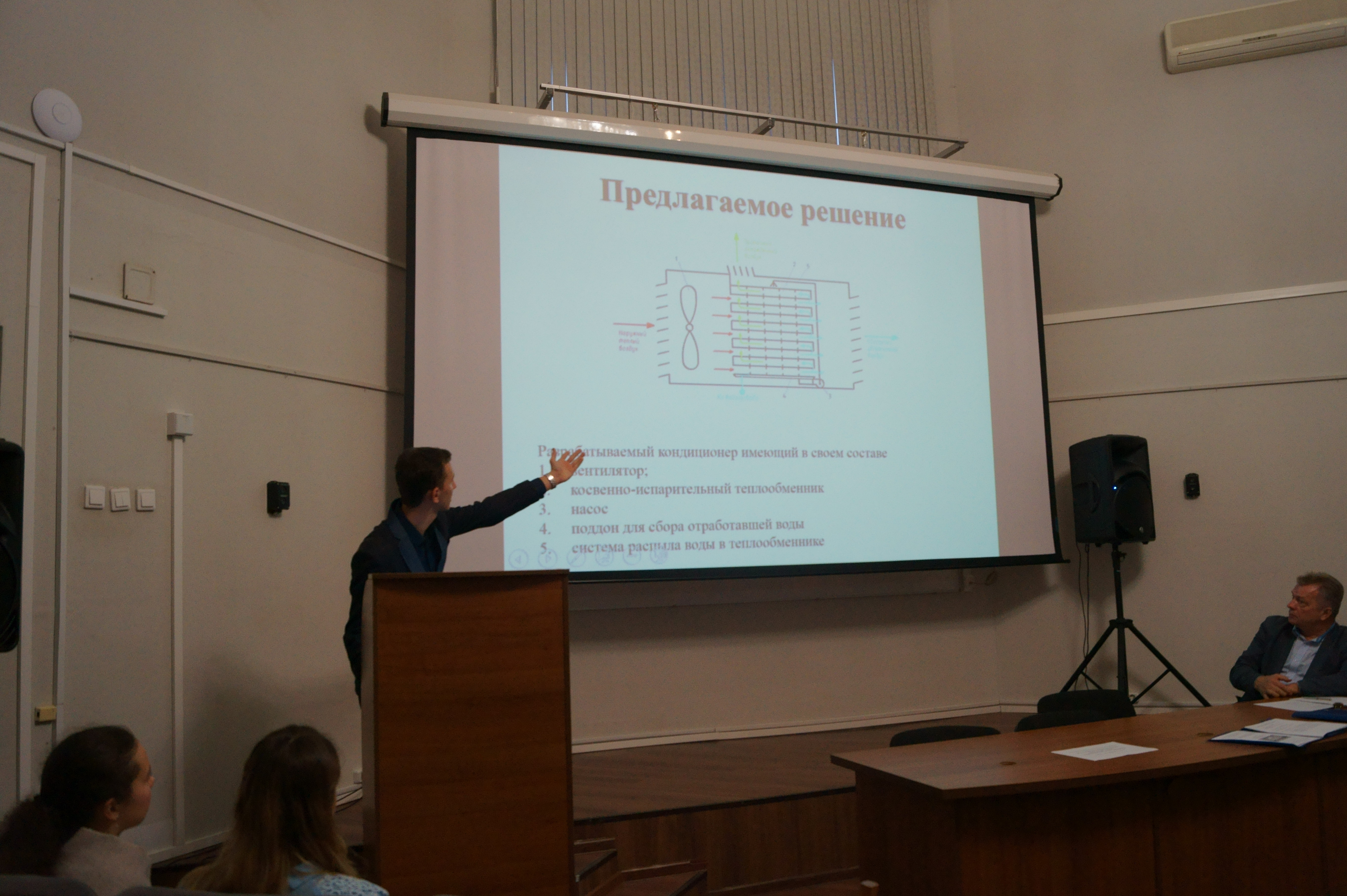 Сидорин А.А., студент гр. б4-СТЗС41, в своем проекте «Разработка косвенно - испарительного компактного бескомпрессорного кондиционера воздуха» предложил инновационную замену «традиционным» фреоновым кондиционерам. Разработка работает по циклу Майсоценко и основана на психрометрической разности температур воздуха.