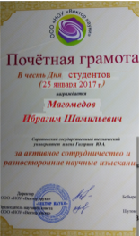 25 января каждый год российские студенты отмечают свой «профессиональный» праздник. В рамках празднования Дня российского студенчества старосте группы б2-СТЗС31 Магомедову И. была вручена Почетная грамота «За активную научную и общественную деятельность» в честь Дня студента, студенты группы б2-СТЗС31 (куратор группы Артамонова Е.Н.) также присутствовали на официальном открытии катка на стадионе СГТУ и старте Фестиваля неоновых красок.