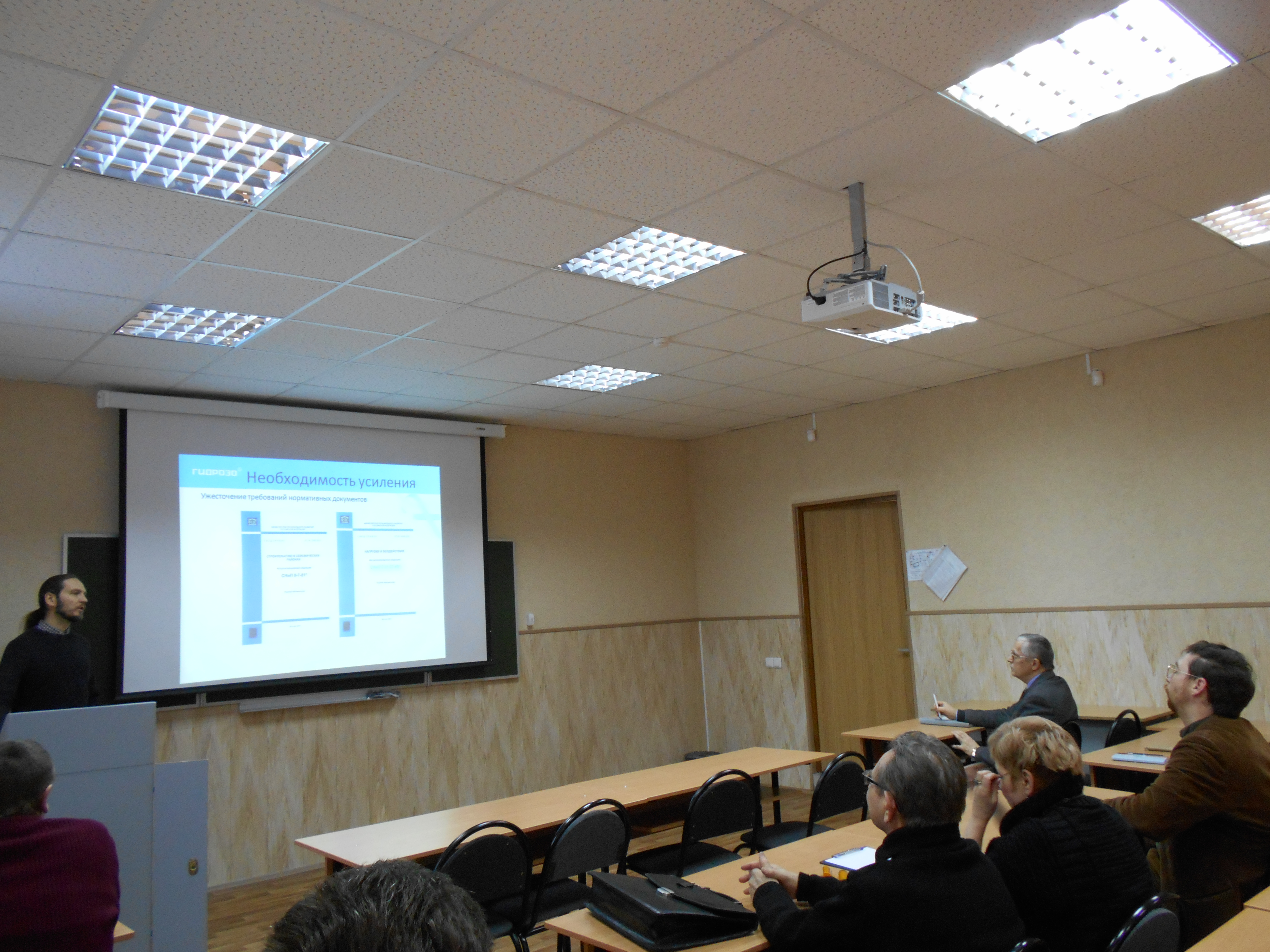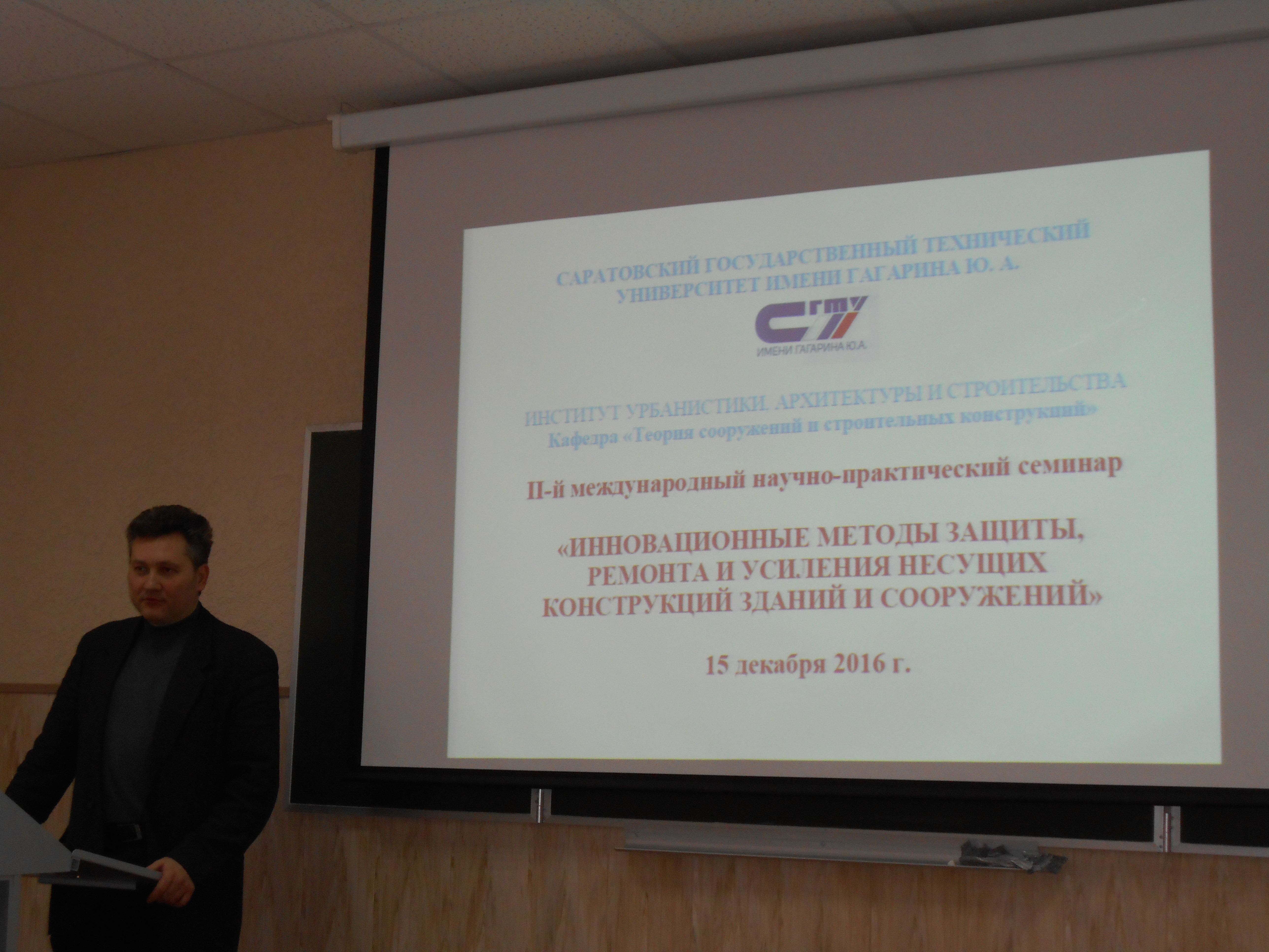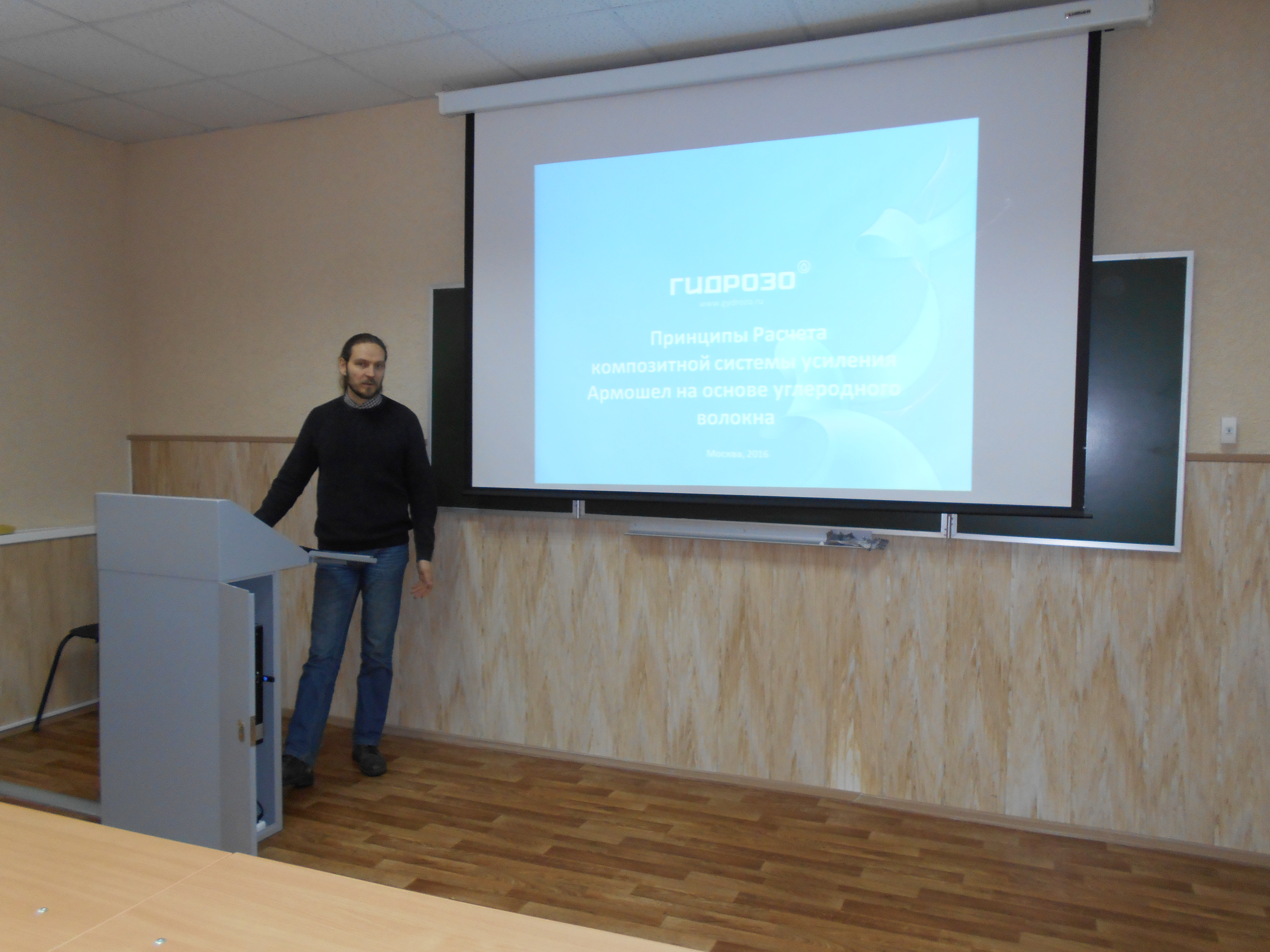 15 декабря на кафедре ТСК УРБАС прошел II Международный практический семинар «Инновационные методы защиты, конструкций зданий и сооружений». Участники – студенты групп с1-СЗС41 (куратор - Федоров М.В.), б2-СТЗС41 (куратор - Сурнин А.А.), преподаватели кафедры ТСК, сотрудники ООО «Эпюра-М» г. Саратов, представители фирмы «ГИДРОЗО» г. Москва. В рамках секции представлены доклады по вопросам усиления железобетонных, металлических и деревянных конструкций с помощью наклеенных углепластиков разной модификации. Представители фирмы «ГИДРОЗО» г. Москва представили интересную методику расчета и результаты натурных лабораторных испытаний усиленных конструкций.