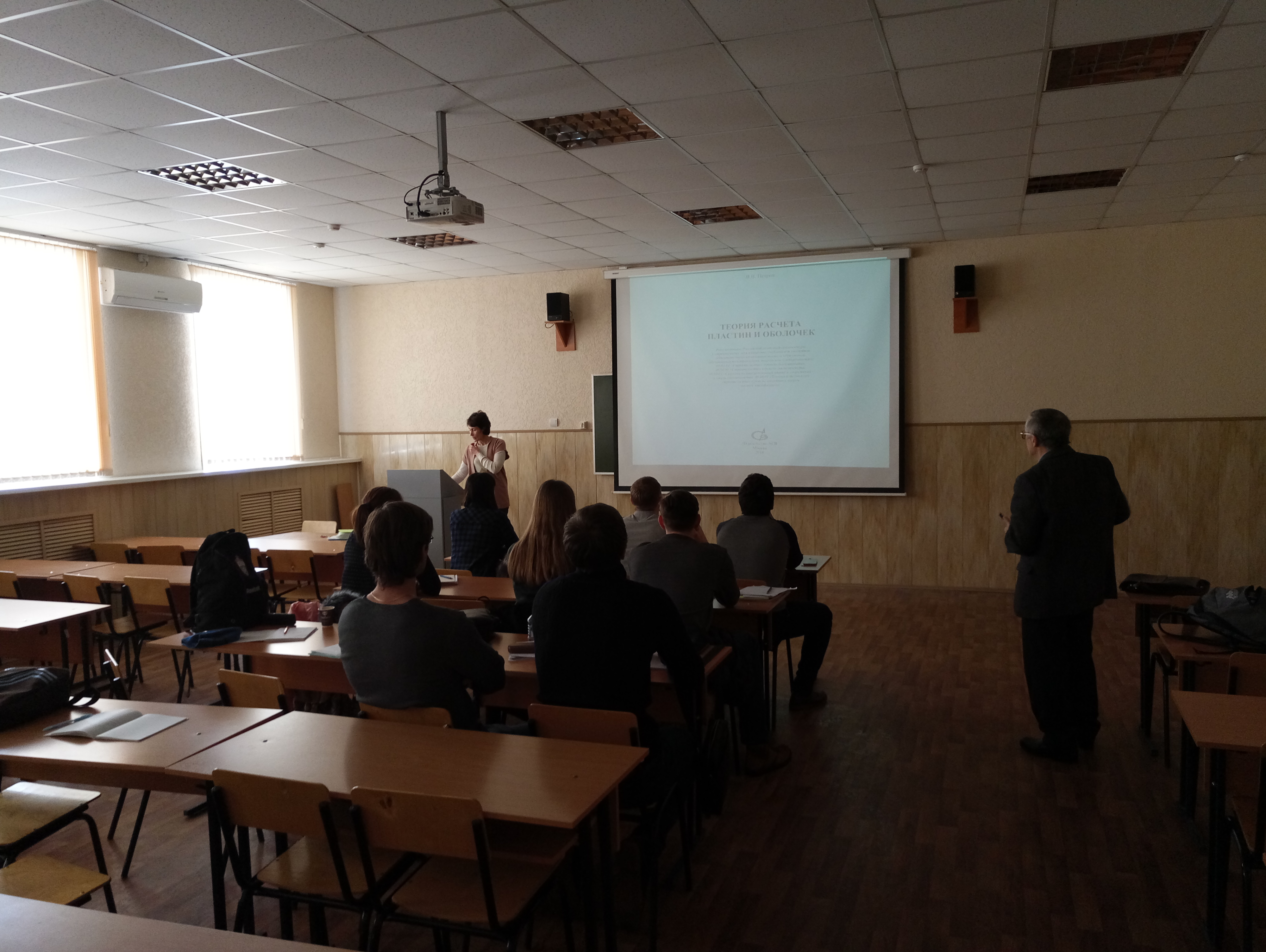 В презентации доцента кафедры ТСК Т.В. Варламовой студенты учебной группы с1-СЗС41 (куратор доцент кафедры ТСК В.И. Редков) получили сведения о примерах уравнения изгиба пластинки, где обсуждаются аналитические, вариационные и численные методы расчета упругих конструкций.