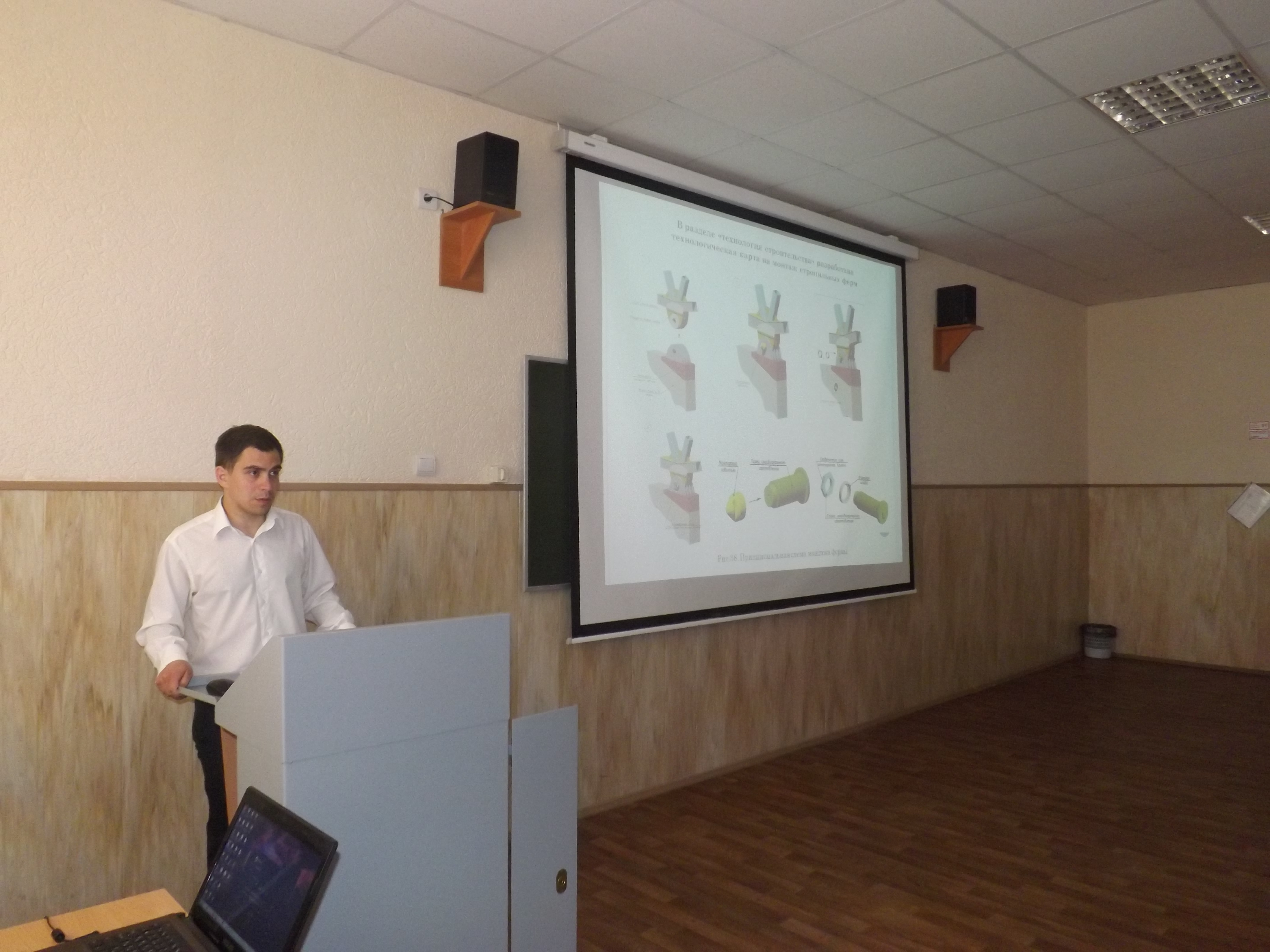 Представленные доклады и презентации ВКР дипломников имели ряд новых научных исследований и современных аспектов научного раздела, интересное сравнение предложенных методик расчетов, обсуждены вопросы архитектурной, экономической, экологической, технологической части ВКР. Все выпускники защитились на оценку «отлично». М.М. Поповкин. (Многофункциональное 36-этажное здание башенного типа в г. Саратове) презентацию выполнил в виде анимации, что позволило просмотреть проект с разных точек обзора и выделить преимущества предлагаемой концепции. Среди докладов выпускников необходимо выделить ВКР А.А. Савочкина. (Реконструкция учебно-тренировочного центра спортивно-оздоровительного комплекса «Авангард» с трибунами на 4000 зрителей в г. Ялта) руководитель доцент кафедры ТСК В.И. Редков. В рамках темы предложены 2 варианта основных несущих конструкций – двухконсольных стальных ферм реального действующего объекта в сейсмическом районе строительства Крыма (9 баллов)