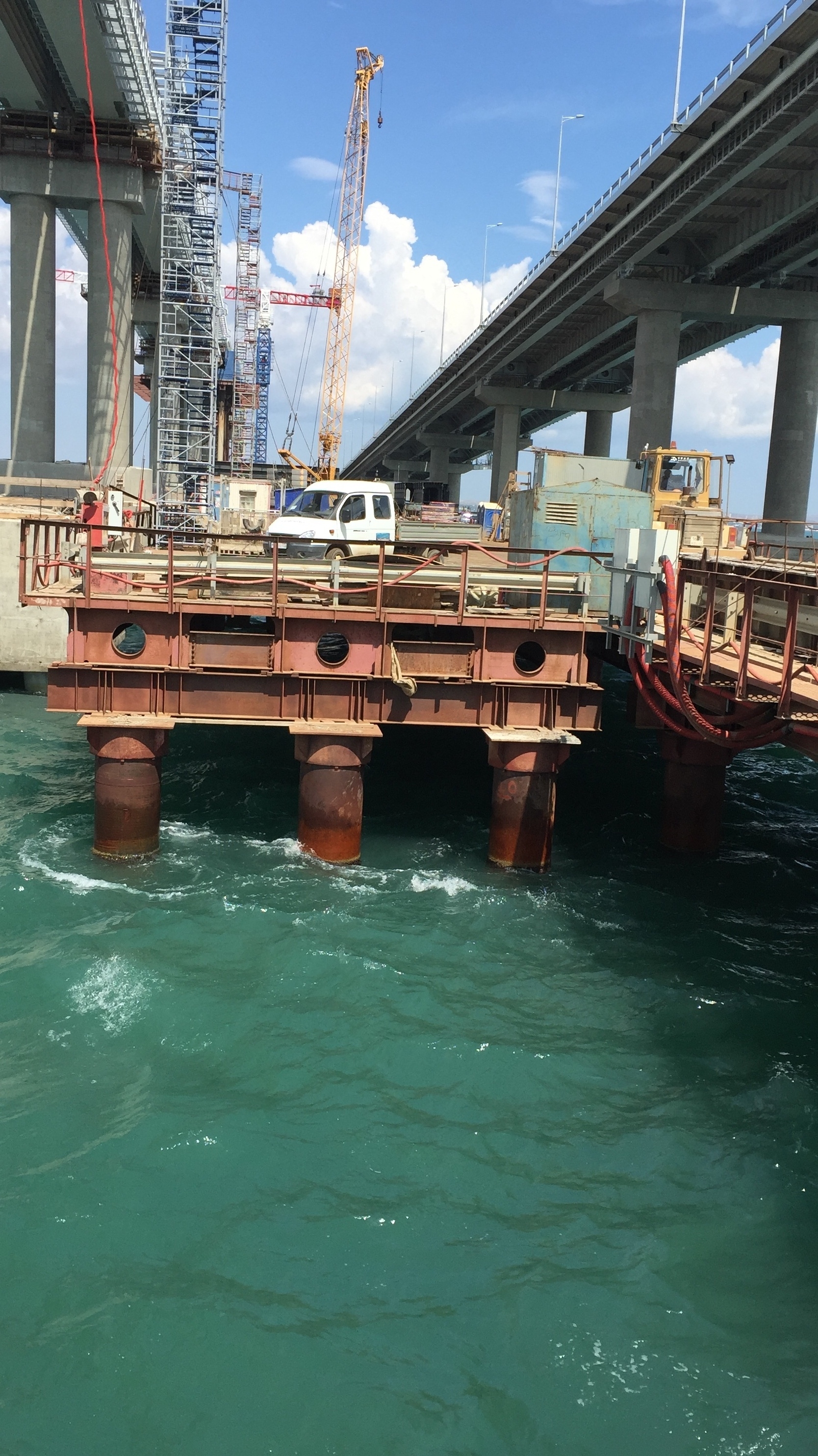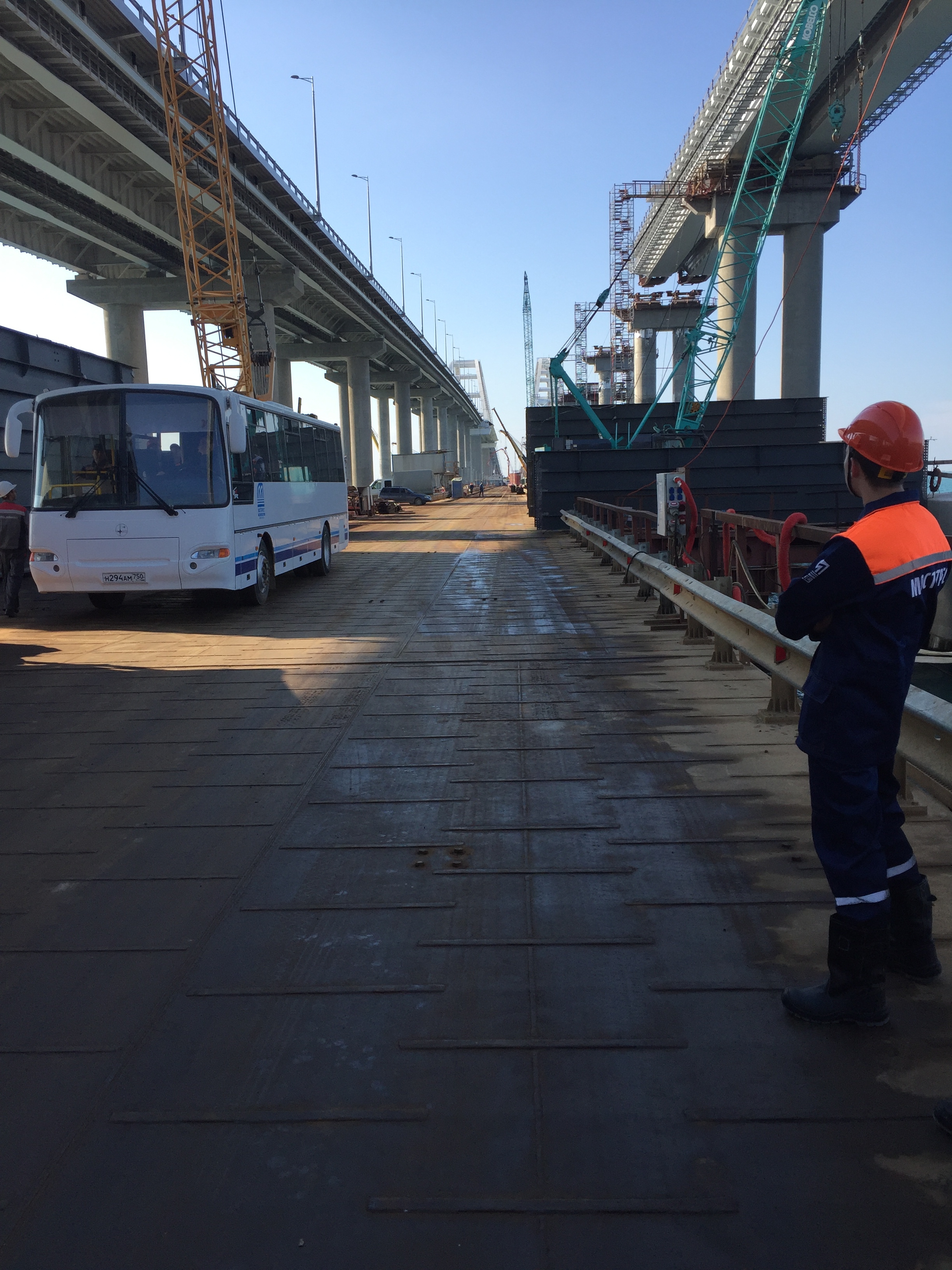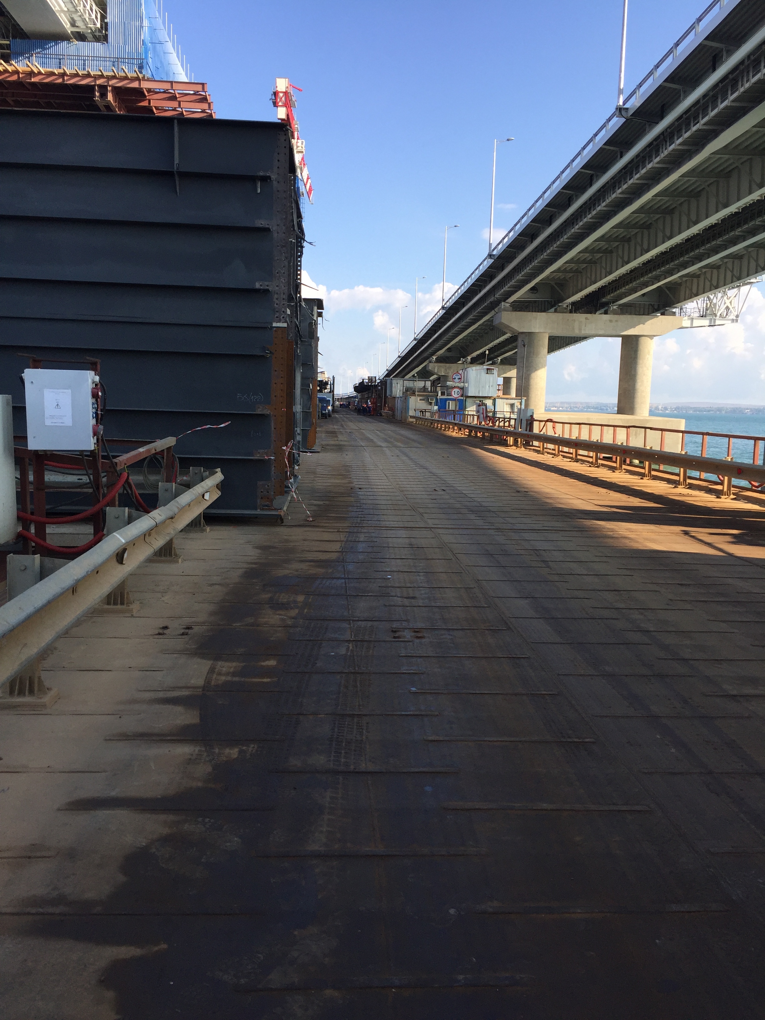 И. Гучигов рассказал о продольной надвижке балочного пролета железнодорожного моста длиной 50 м. Конструкции данного пролета собирались из заводских блоков и надвигались по скользящим устройствам на готовые опоры домкратами. Скорость движения на данном этапе составила около 45 миллиметров в минуту. Аналогичным способом на морских участках формировалось автодорожное полотно Крымского моста.