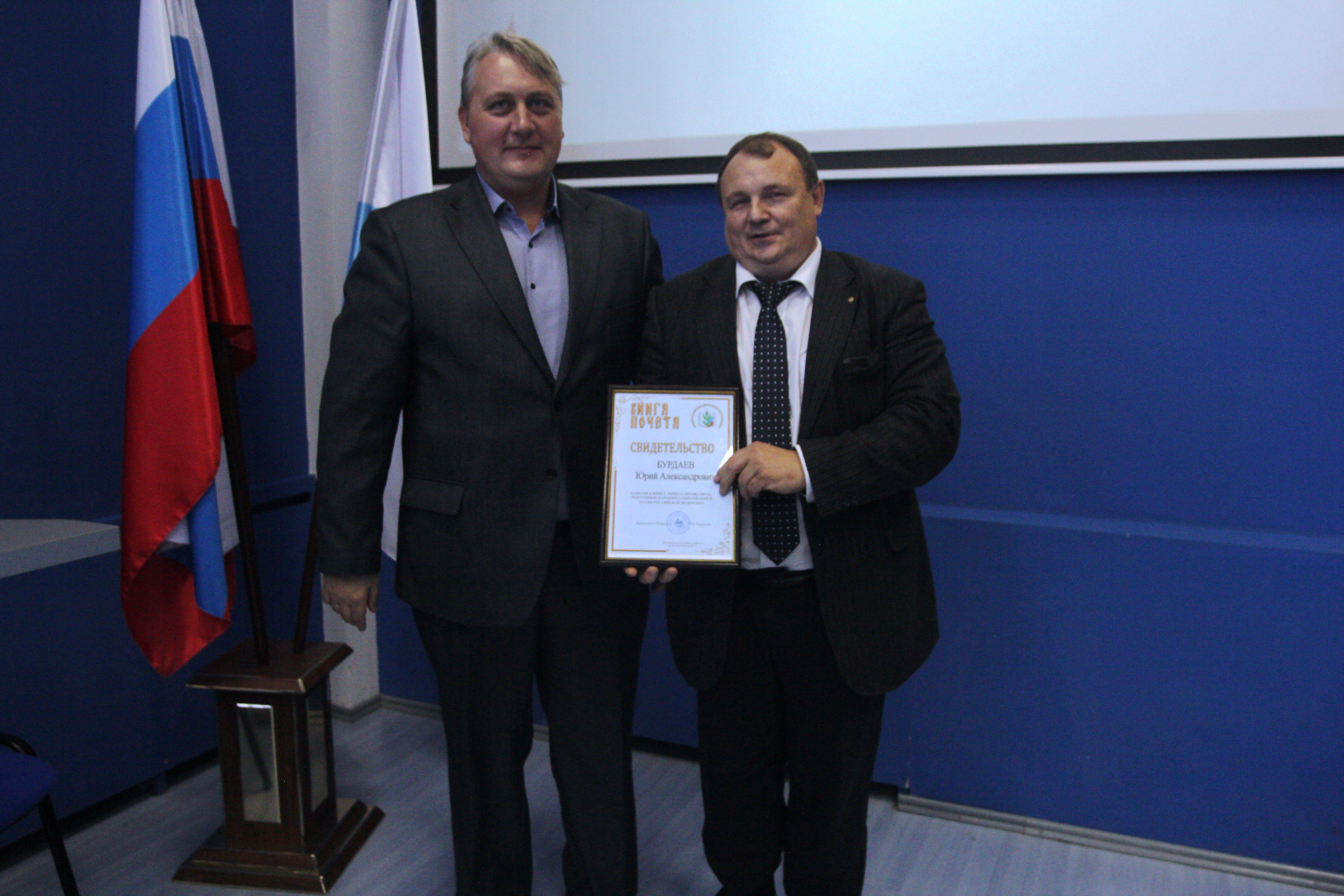 Юрий Бурдаев получил свидетельство о занесении его имени в Книгу почета профсоюза работников народного образования и науки Российской Федерации.