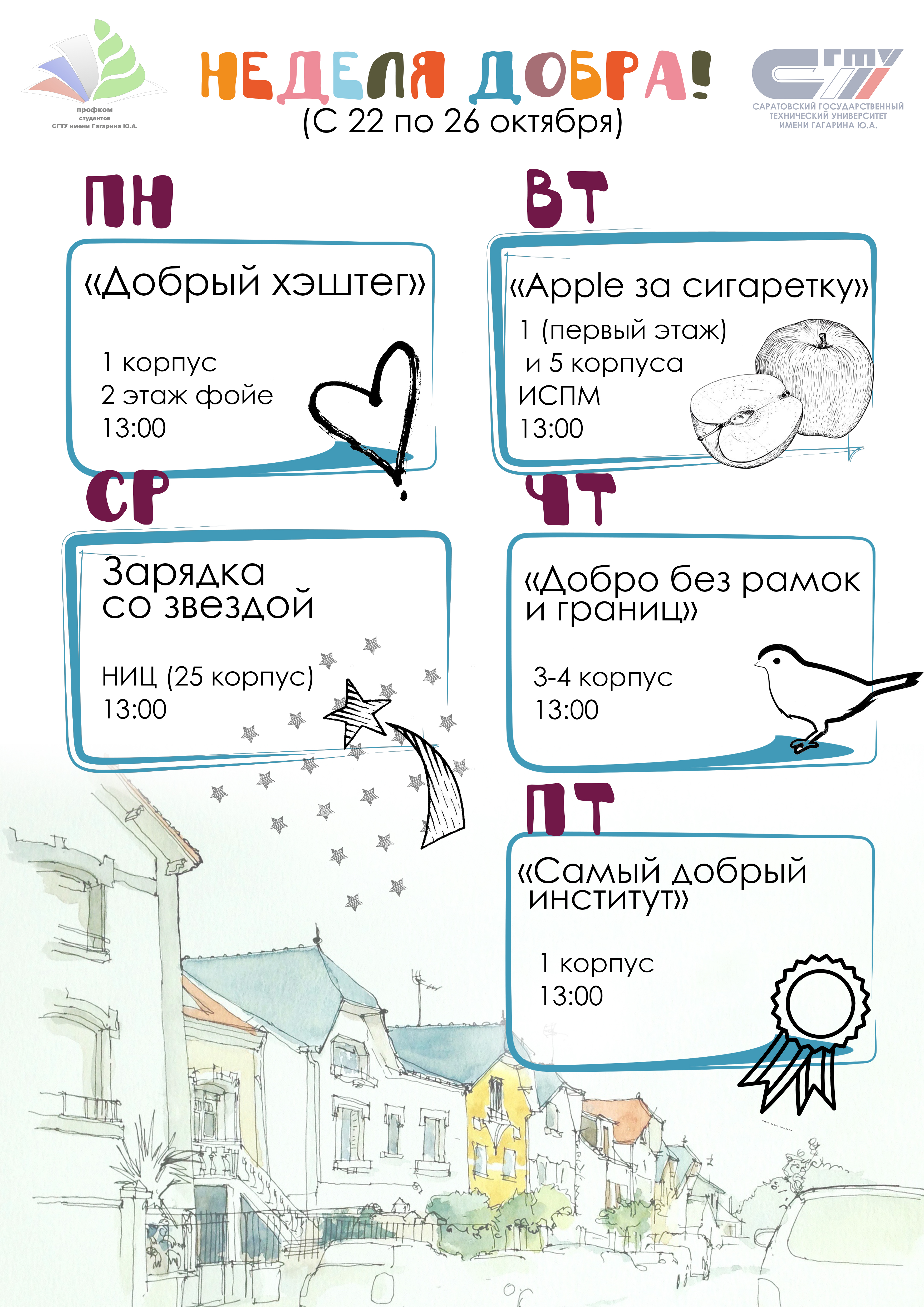 С 22 по 26 октября 2018 года в СГТУ пройдет ежегодная акция «Неделя добра». На протяжении недели будут проводиться различные акции и конкурсы.