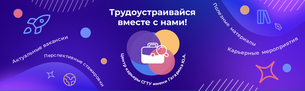 Центр карьеры СГТУ имени Гагарина Ю.А. – успешно функционирующее подразделение университета, созданное в 2021 году для осуществления комплексной поддержки студентов по вопросам содействия трудоустройству, всестороннего карьерного развития, профессиональной навигации обучающихся всех направлений подготовки.