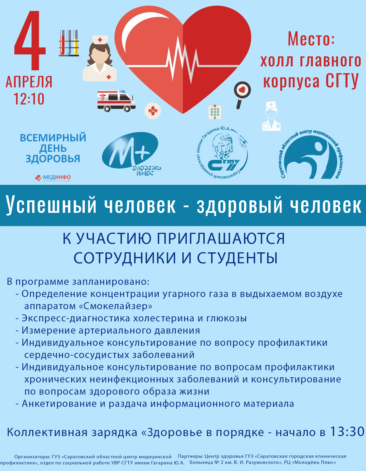 4 апреля 2019 года с 12:00 до 14:00 в фойе главного корпуса СГТУ пройдет акция «Успешный человек – здоровый человек!».
