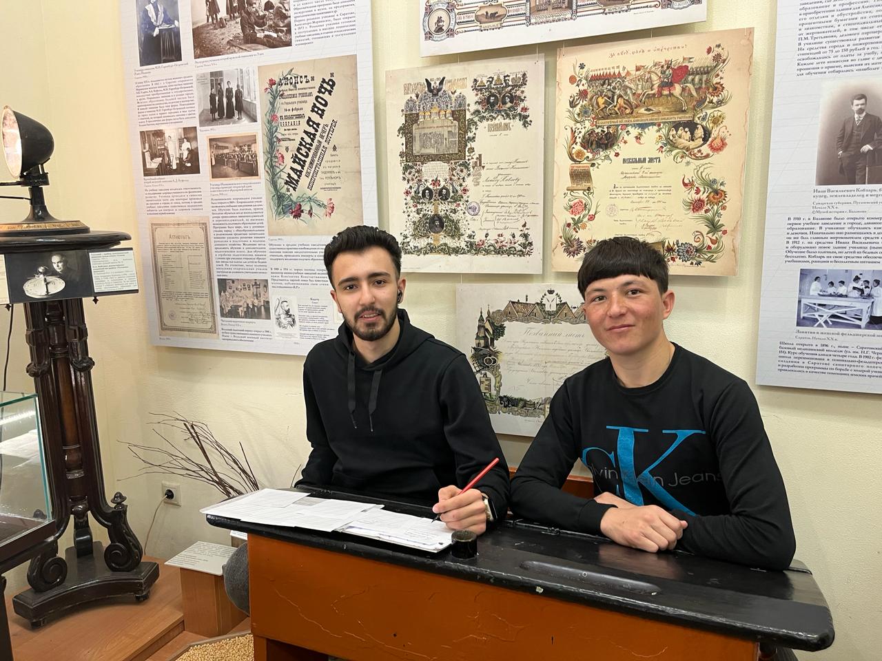 На выставке «Как учились в разные времена. Из истории образования в Саратовском крае» участники экскурсии познакомились с первыми учебными заведениями и выдающимися саратовскими педагогами. Узнав, как использовали гусиное перо и чернила в прошлом, студенты сами попробовали написать пару строк.