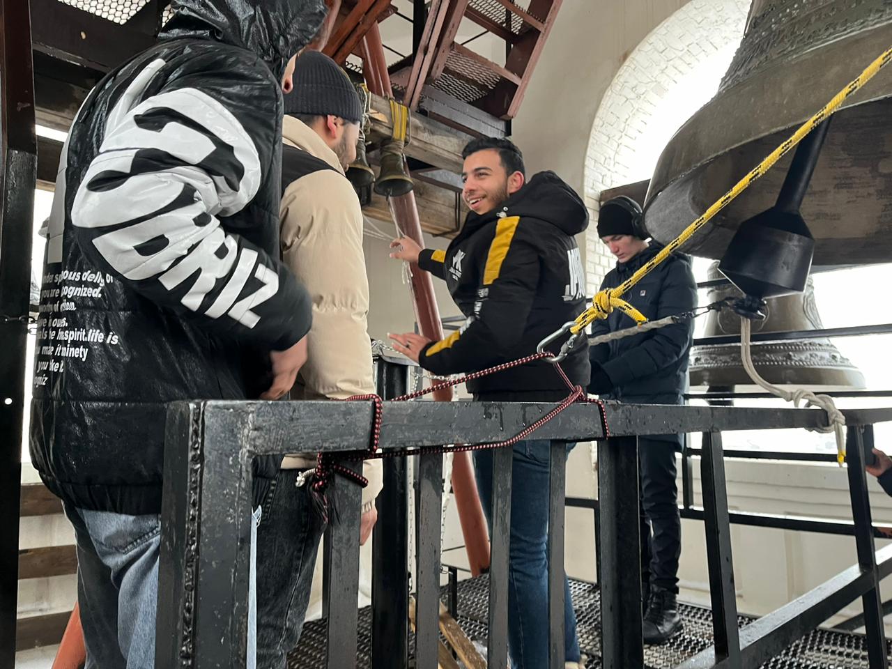 Экскурсия продолжилась на колокольне, где гагаринцы услышали звон колоколов и смогли попробовать себя в роли звонарей.