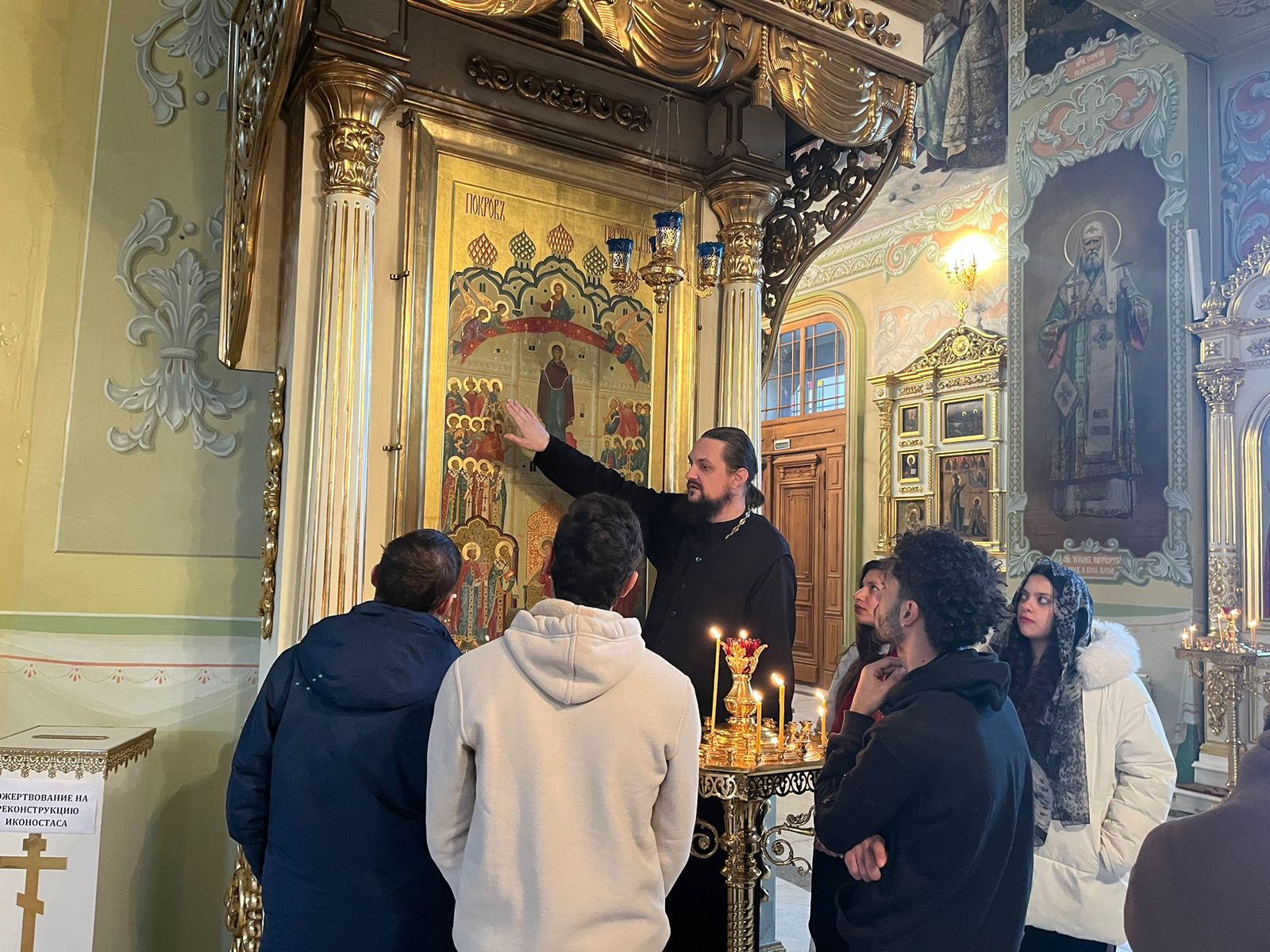 Руководитель Историко-архивного отдела Саратовской епархии, иерей Кирилл Петрович рассказал много значимых фактов из истории собора, праздниках Покрова Пресвятой Богородицы и Крещения Господня. Также студенты осмотрели иконы и внутреннюю роспись собора.