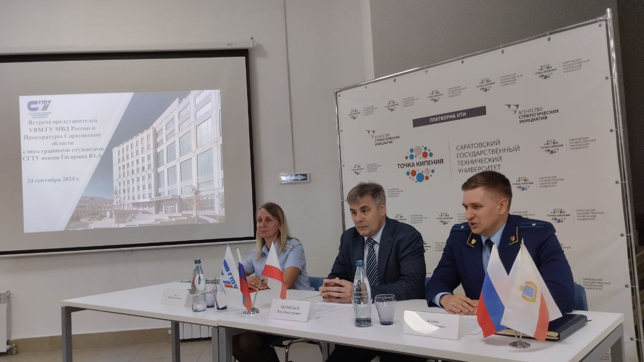 В «Точке кипения» СГТУ имени Гагарина Ю.А. состоялась встреча иностранных студентов с прокурором отдела по надзору за соблюдением законов в социальной сфере Саратовской области Денисом Ждановым и начальником отдела разрешительно-визовой работы ГУ МВД России по Саратовской области Зинаидой Цух.