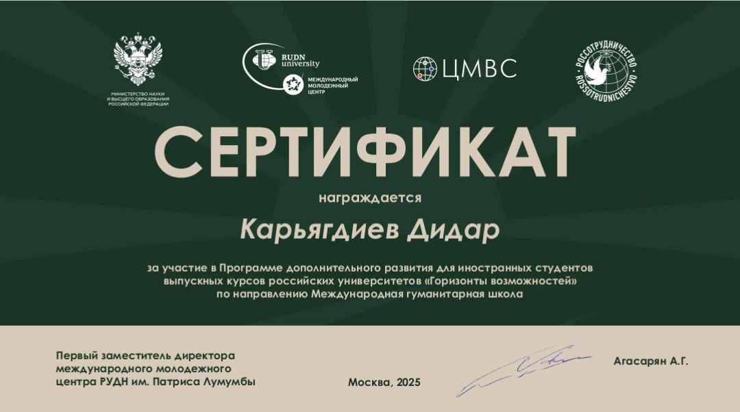 Дидар Карьягдиев, студент 2 курса Социально-экономического института Саратовского государственного технического университета имени Гагарина Ю.А. из Туркменистана успешно прошел обучение по образовательной программе «Горизонты возможностей».