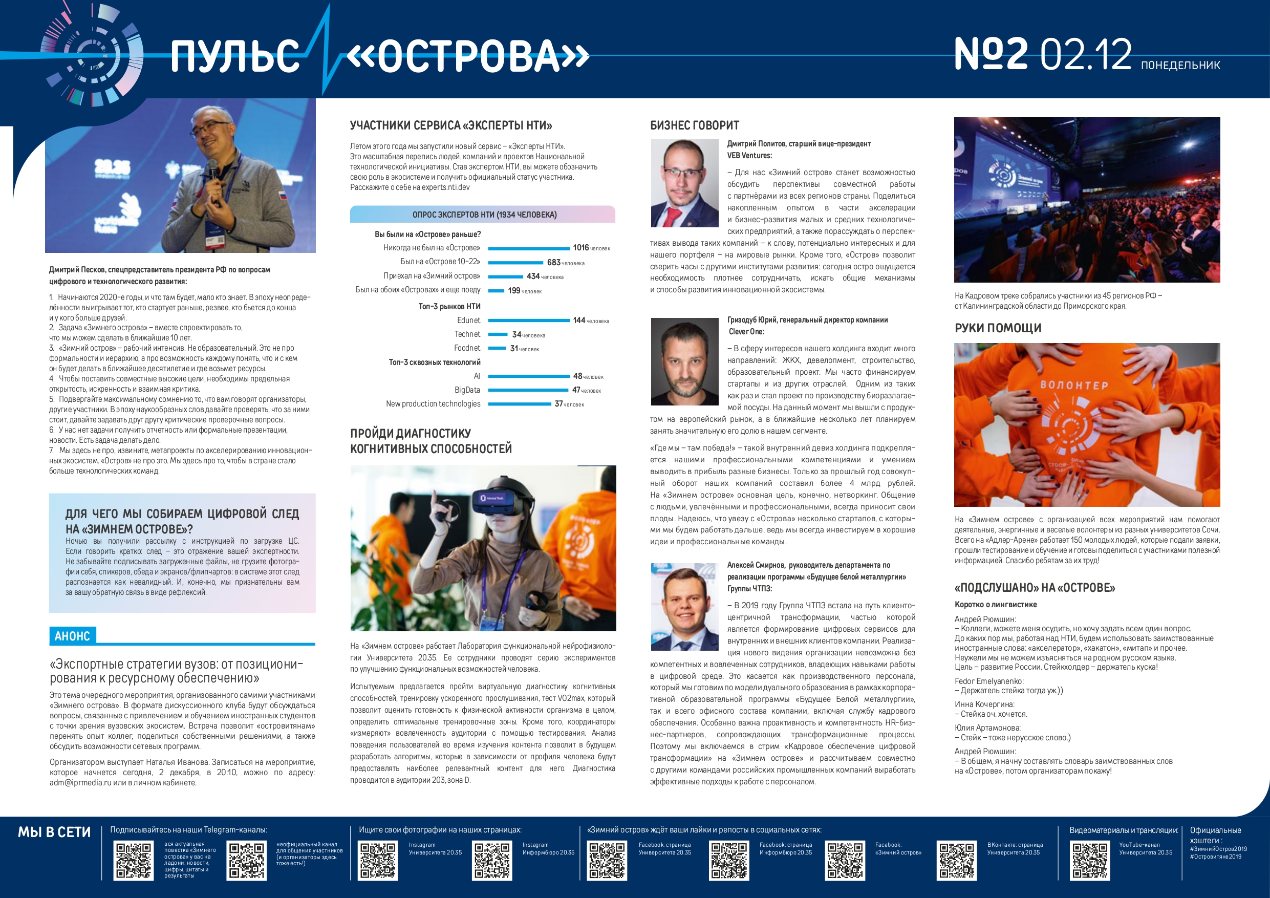 Делегация опорного вуза завершила работу на интенсиве «Зимний остров», организованном автономной некоммерческой организацией «Университет национальной технологической инициативы 2035», который прошел в Сочи с 1 по 4 декабря 2019 года в рамках Недели технологического лидерства. Целью его работы стало создание совместных цифровых продуктов, проектов для цифровой экономики и поддержки стартапов. Мероприятие объединило свыше 1500 участников из 70 российских регионов, спикеров из Китая, Японии, Индии, Германии, США.