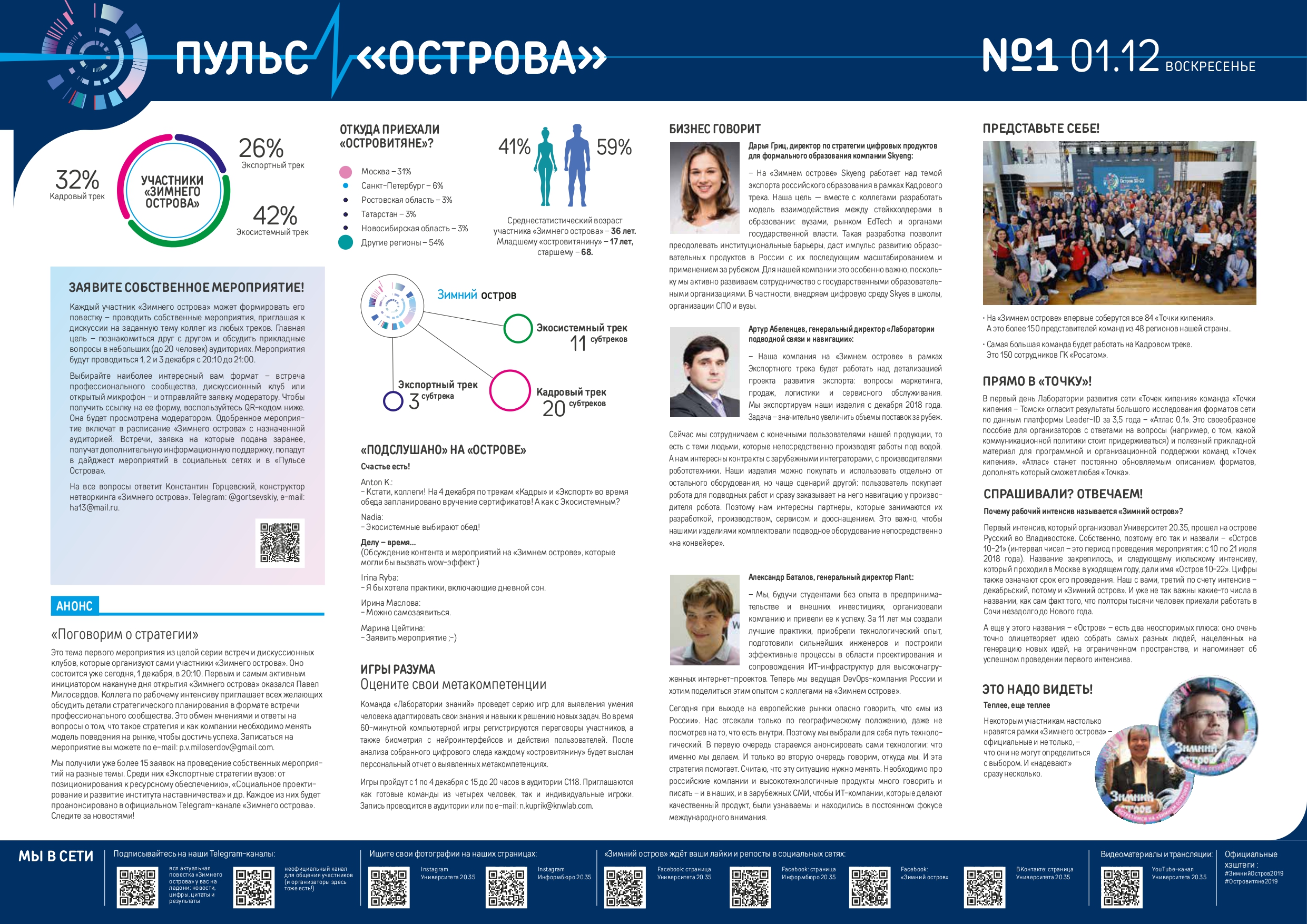 «Зимний остров» был разделен на три тематических направления – экспортный, кадровый и экосистемный треки. Все четыре дня декабря участники обсуждали, в том числе, наилучшие способы вывода российских проектов и продукции на мировой рынок. Также речь шла о подготовке кадров для цифровой экономики. Среди тех, кто представил свои идеи на «Зимнем острове», были и победители конкурса «Лидеры России».
